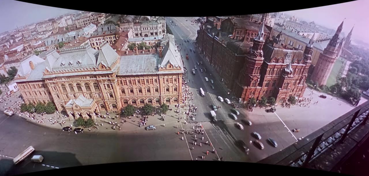 Following an introduction by Bing Crosby, the Cinerama screen widens for scenes of landscapes, cities, peoples, and entertainments of the Soviet Union. Highlights include the historic buildings and churches of Moscow, as the Kremlin; its subway and streets, a spring carnival, the seaside resorts on the Black Sea, a trip down the Volga River, skiers, a troika racing along a snow-covered road, a helicopter view of the North Pole, an Antarctic whale hunt, the capture of a wild boar in the Moyun-Kum of Central Asia, a race by reindeer-drawn sleds, divers in the Sea of Okhotsk, battling an octopus, the capture of antelopes, rafting logs down the Tisza River, and the development of new towns in Siberia. Other scenes include a visit to the Moscow Circus, where the renowned clown Oleg Popov performs, the dancing of the Moiseyev and Piatnitsky companies, and excerpts from the repertoire of the Bolshoi Theater Ballet.
