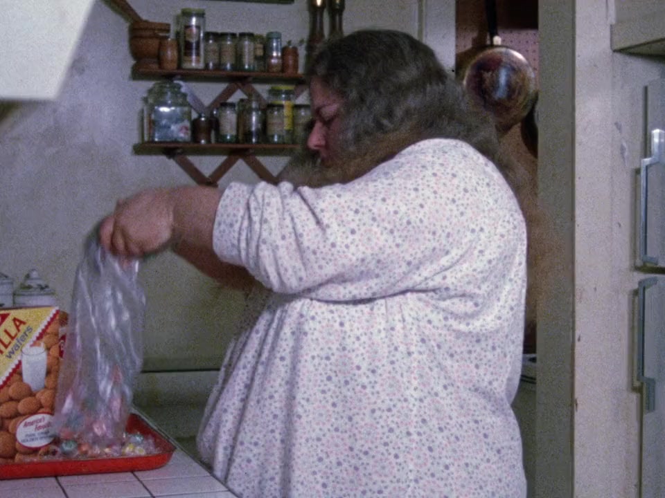An obese woman recently released from an insane asylum kills anyone who attempts to get her to stop eating.