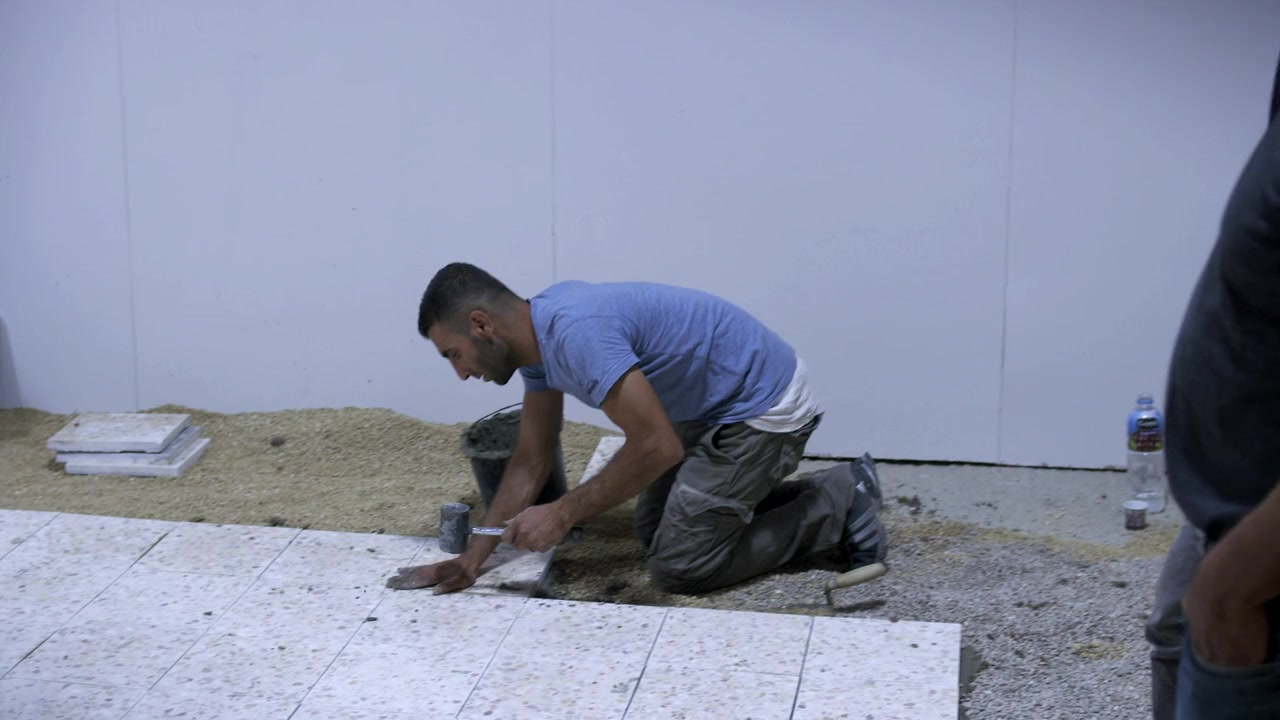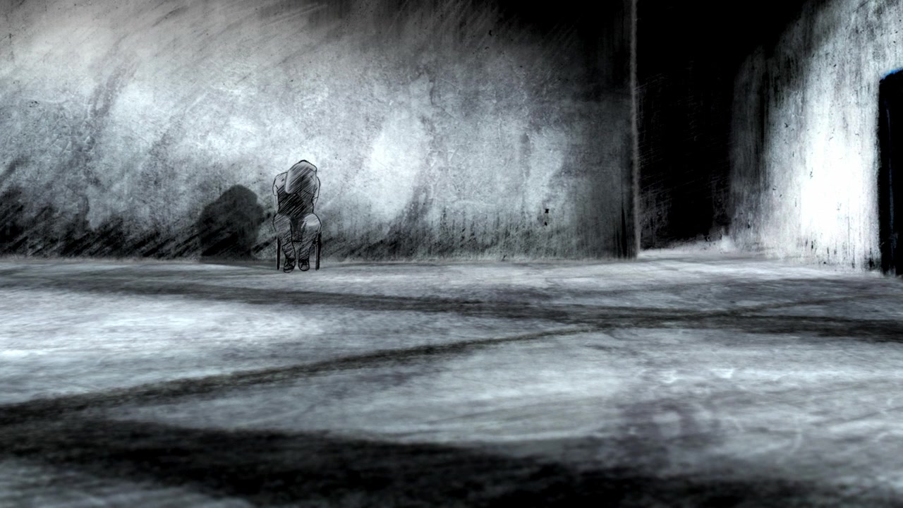 A set-up for an experiment in an empty room. Former inmates reconstruct an Israeli secret service interrogation centre. These Palestinian men use role play to come to terms with their memories and the humiliation they have experienced.