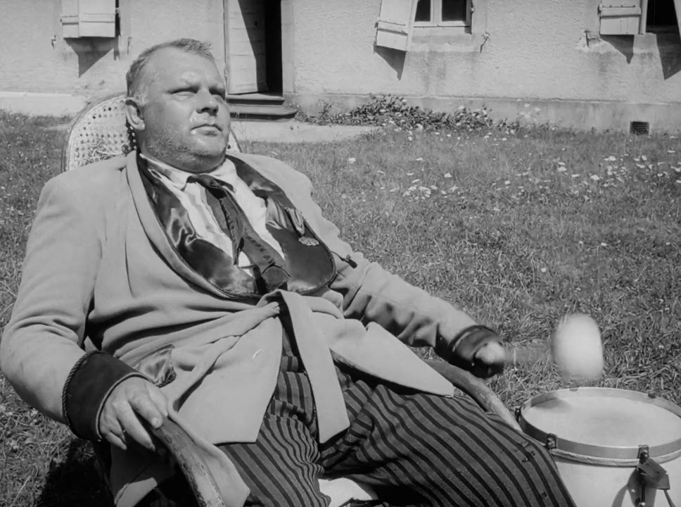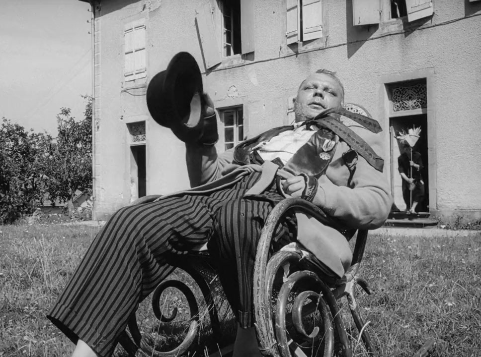 A small and thin barefoot slave (played by Polanski) plays a flute and beats a drum to entertain his large master who rocks in a rocking chair in front of his mansion. The slave jumps and leaps like a madman, wipes his master's brow, feeds him, washes his feet, shades him from the sun with an umbrella and holds a urinal for him.