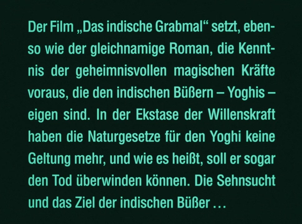 Ayan, Maharajah of Eschnapur, believes that his wife, Princess Savitri, has been unfaithful to him with officer Mac Allan. He decides to bury her alive, so he sends the Yogi Ramigani to England to look for Herbert Rowland, an architect; but when he orders him to build a tomb, Rowland refuses.