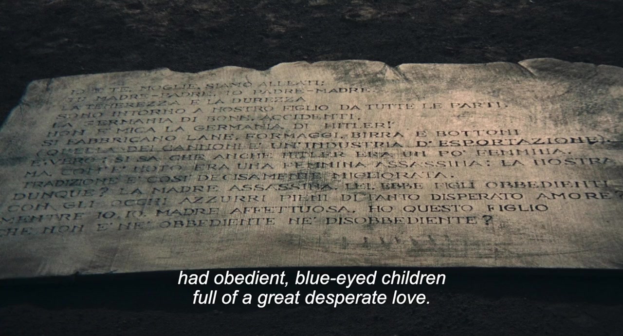 Two dramatic stories. In an undetermined past, a young cannibal (who killed his own father) is condemned to be torn to pieces by some wild beasts. In the second story, Julian, the young son of a post-war German industrialist, is on the way to lie down with his farm's pigs, because he doesn't like human relationships.