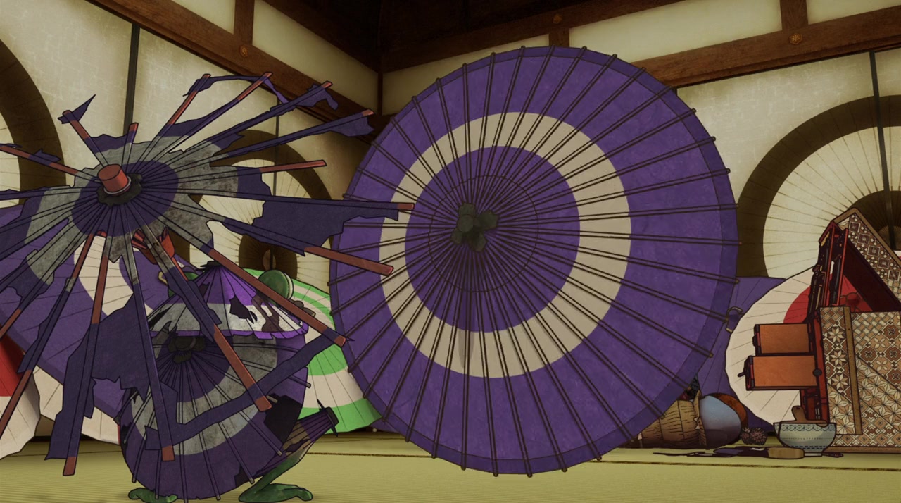 A traveler is confronted by spirits in an abandoned shrine; a story of honor and firefighting in ancient Japan; a white bear defends the royal family from a monstrous red demon; ragtag soldiers battle a robotic force in futuristic Japan.