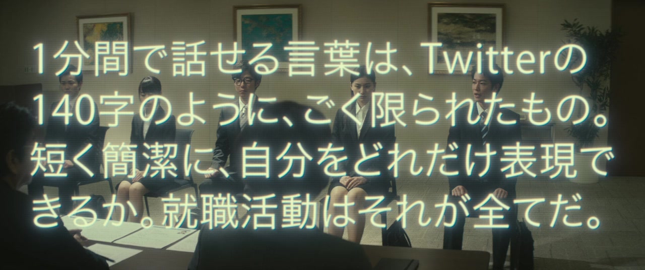 5 university students gather to exchange information on their job search activities. They encourage each other and post their thoughts & worries on Twitter, but behind that they have a lot on their minds. Takuto Ninomiya observes those around him. His roommate Kotaro Kamiya has a bright personality and communicates well with others. Mizuki Tanabe is Kotaro Kamiya’s ex-girlfriend. Takuto Ninomiya has feelings for his roommate's ex-girlfriend. Rika Kobayakawa is determined to land a job. Takayoshi Miyamoto is critical of job-seeking activities, but he later tries to get a job.