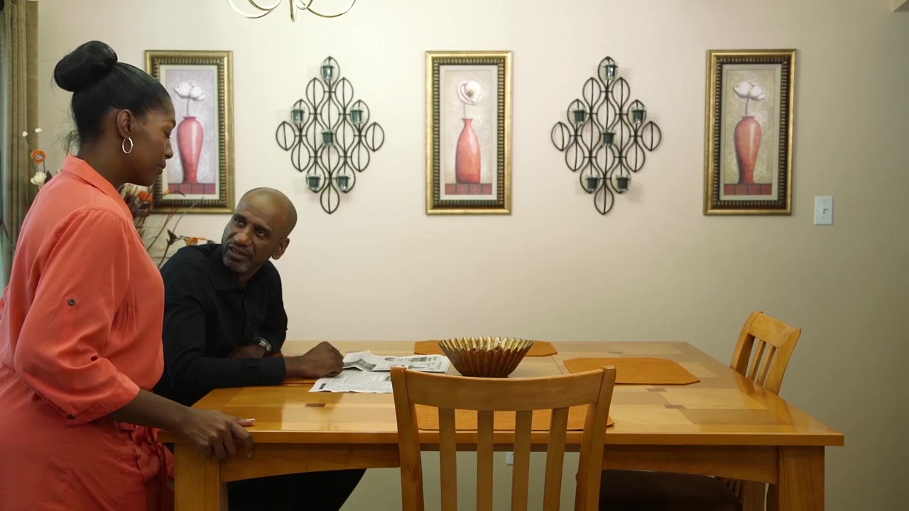 Sinclair with a knife in the kitchen, gym, living room...