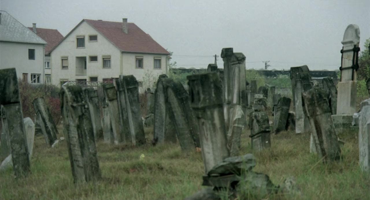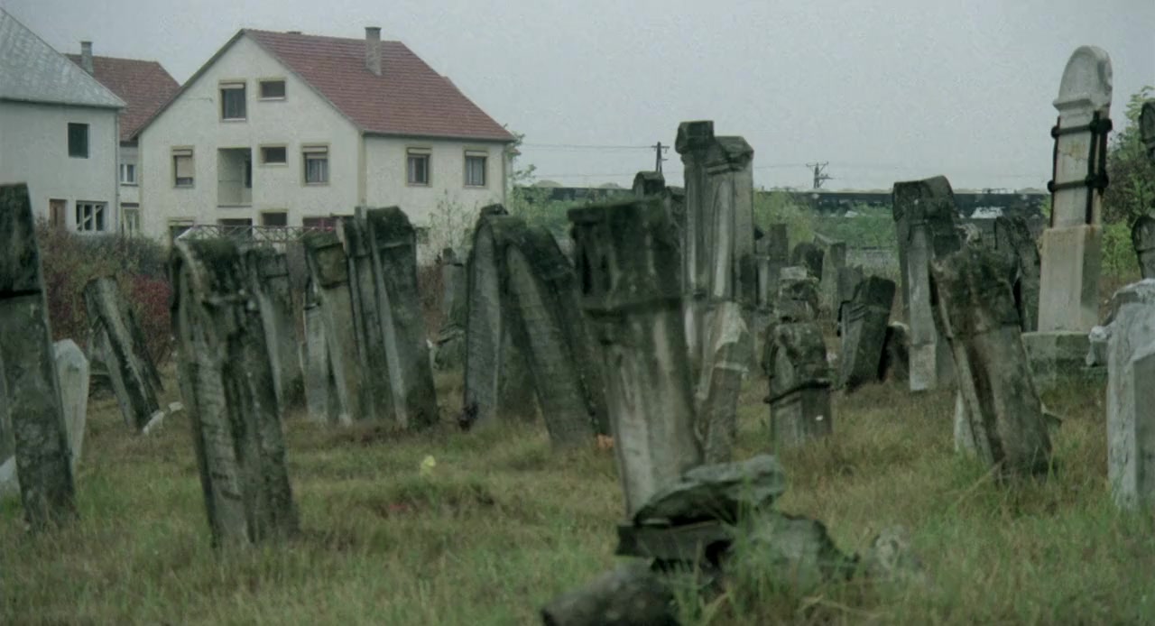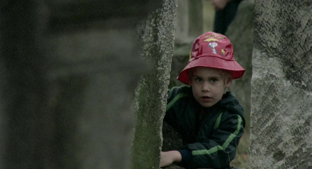 Two rabbis show the ruins of an abandoned synagogue to a group of primary school-age Jewish children, and stand by as the children dip bread in honey, drink wine, pray, and sing.