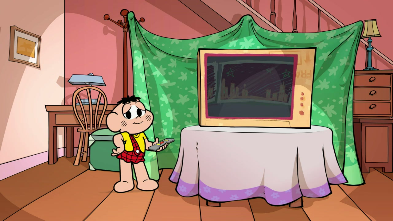 Franjinha, the inventor kid in Monica's gang, tired of reading the comics, invents a new device to read the stories: a kind of a story-processor, that swallows the printed pages and projects the scenes in movement, on the wall.