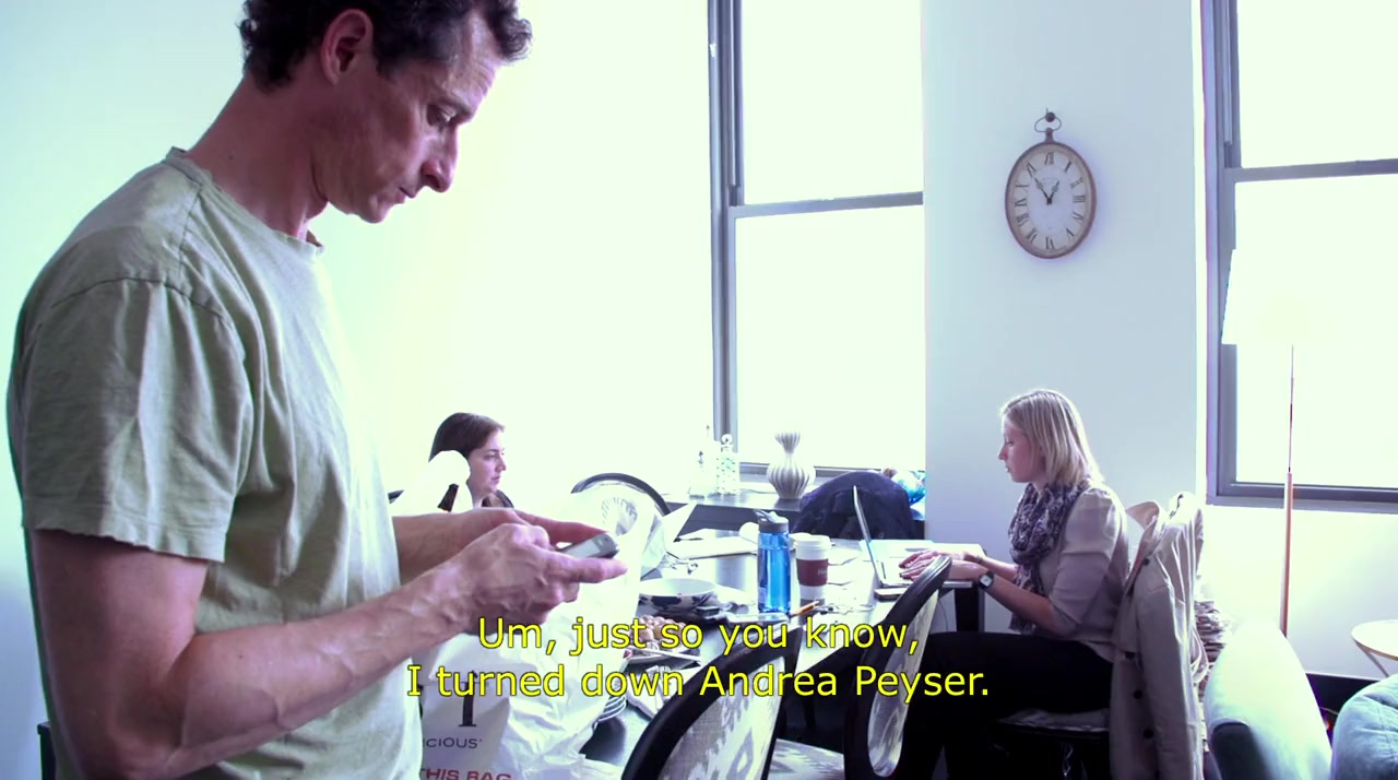 Documentary featuring a jaw-dropping, behind-the-scenes look at the attempted comeback of Anthony Weiner in 2013 as he mounts a campaign for New York City mayor in the wake of his sexting scandal. Featuring unfettered access to the candidate and his campaign.